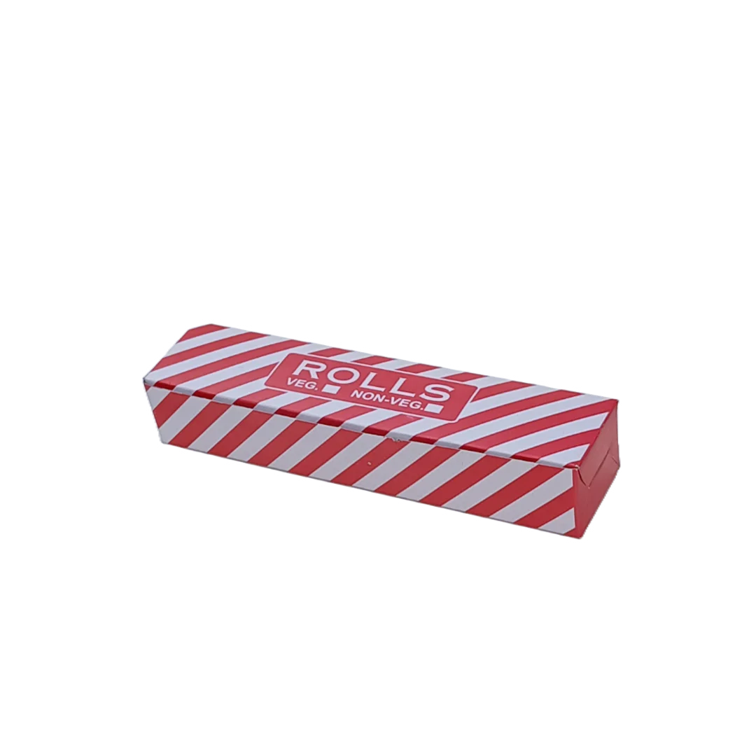 9″x2″x2″ Kathi Roll Box is in Red Stripped colour. Grey Back with Laminated paper and comes in flat way which is easy to assemble. Can hold all types of Kathi rolls and other long food items which fits exactly in the box. Keeps food warm & fresh for longer time. Best Takeaway option for Rolls and mostly used by restaurants, fast food counters, Kiosk and many more.